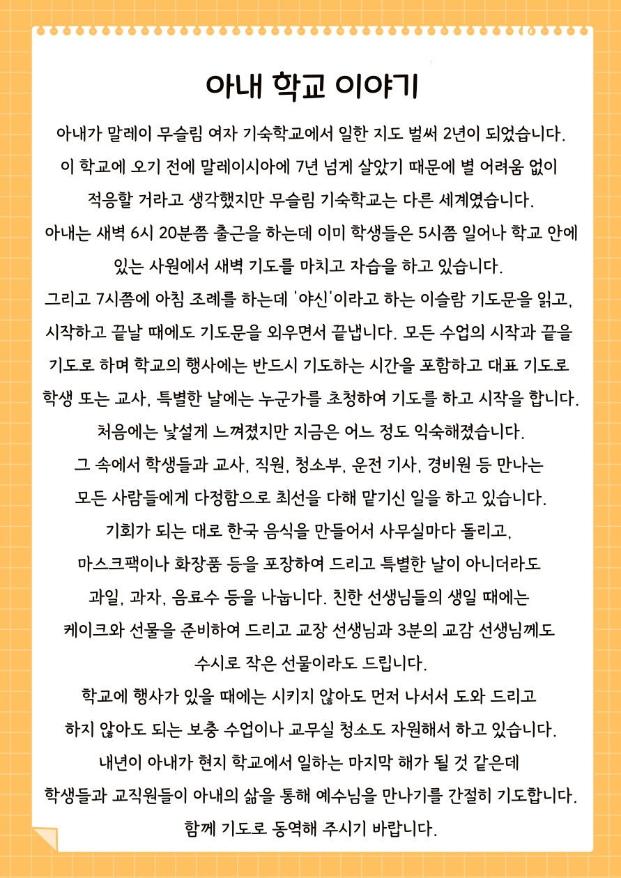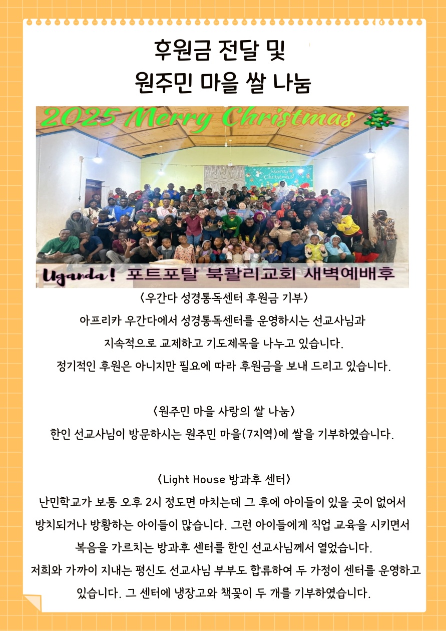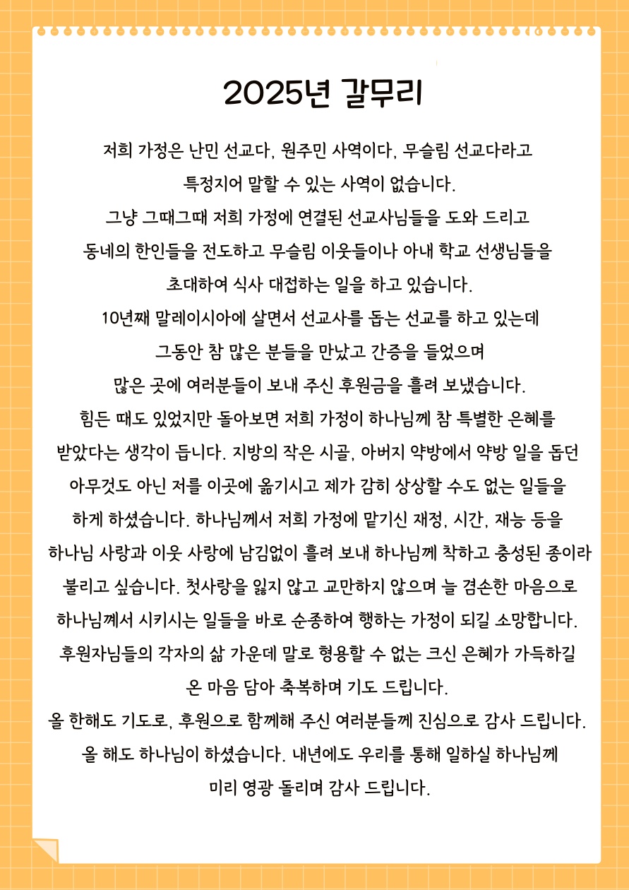 | 이전글 | 202512 한영훈, 오수정 선교사의 기도편지_1 | 김성우 | 2025.12.27 | 0 | 63 |