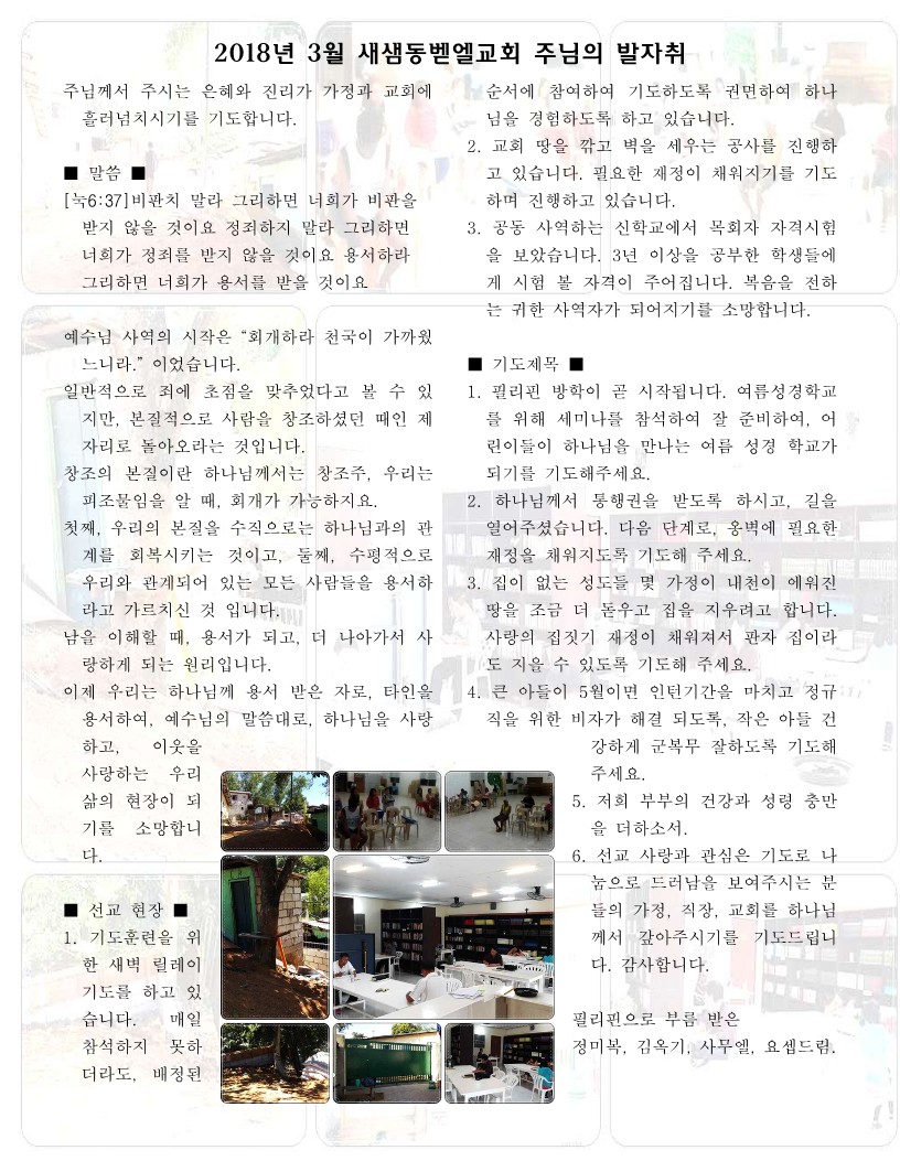 2018년 3월 새샘동벧엘교회 선교편지