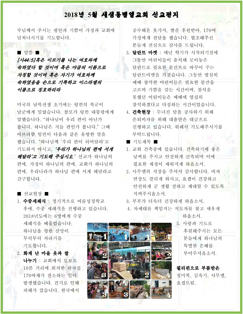 2018년 5월 새샘동벧엘교회 선교편지