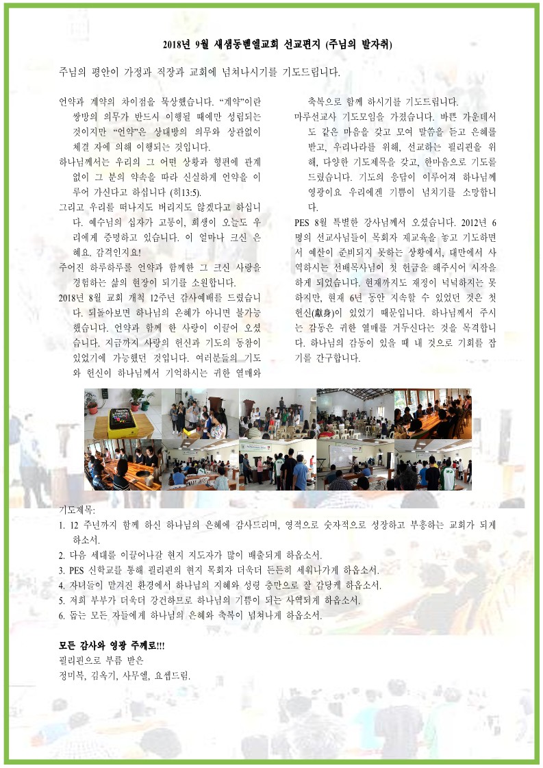 2018년 9월 새샘동벧엘교회 선교편지